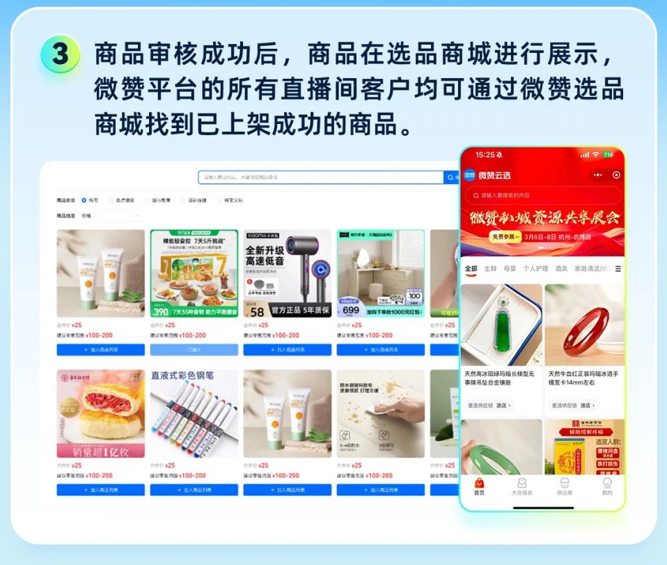步骤3:商品审核成功后,商品将在选品商城进行展示,微赞平台的所有直播间客户均可通过微赞选品商城找到已经上架成功的商品。