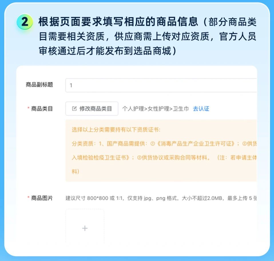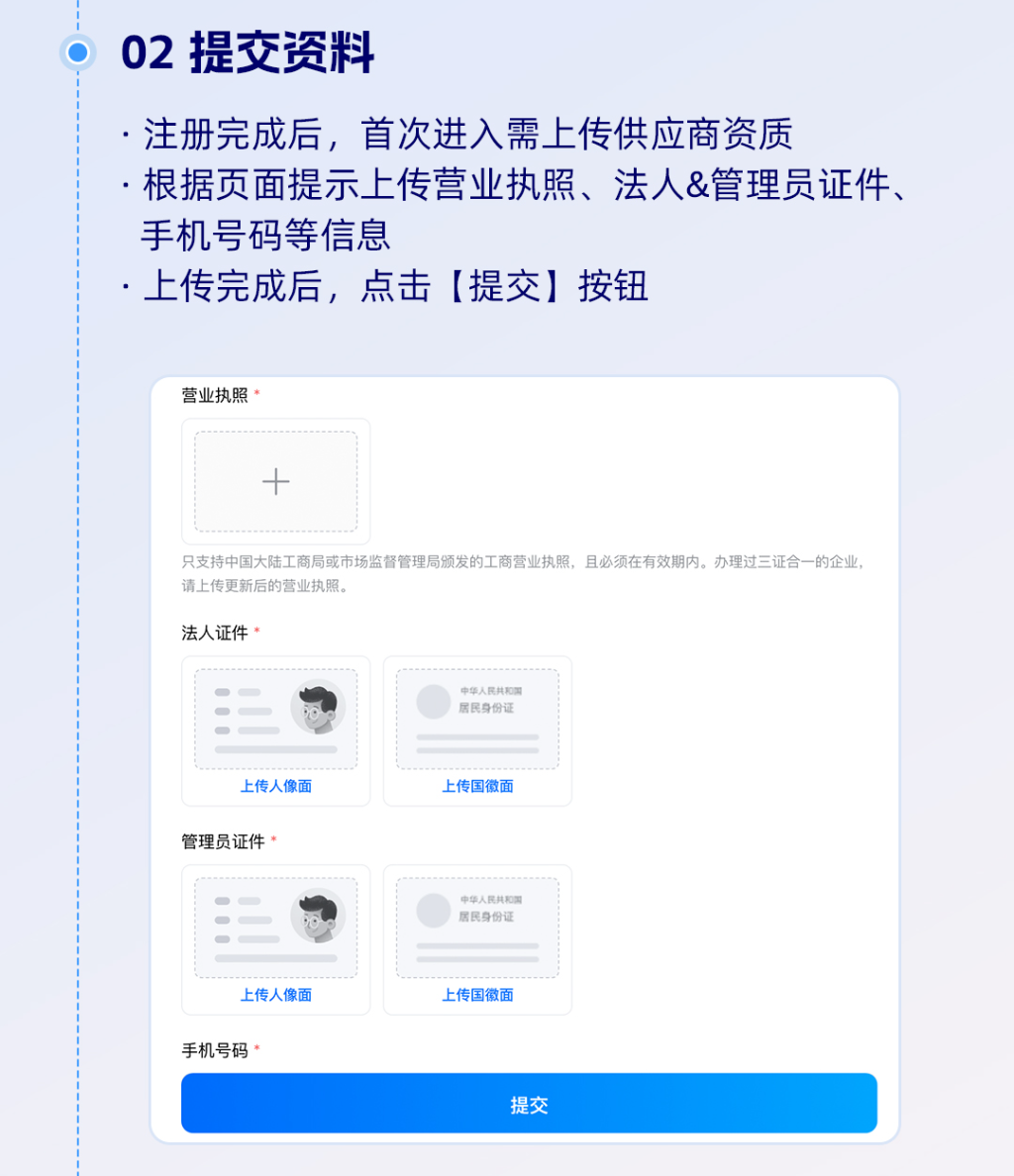 首次进入需上传供应商资质,根据页面提示上传(营业执照、法人及管理员证件、手机号码)等信息。