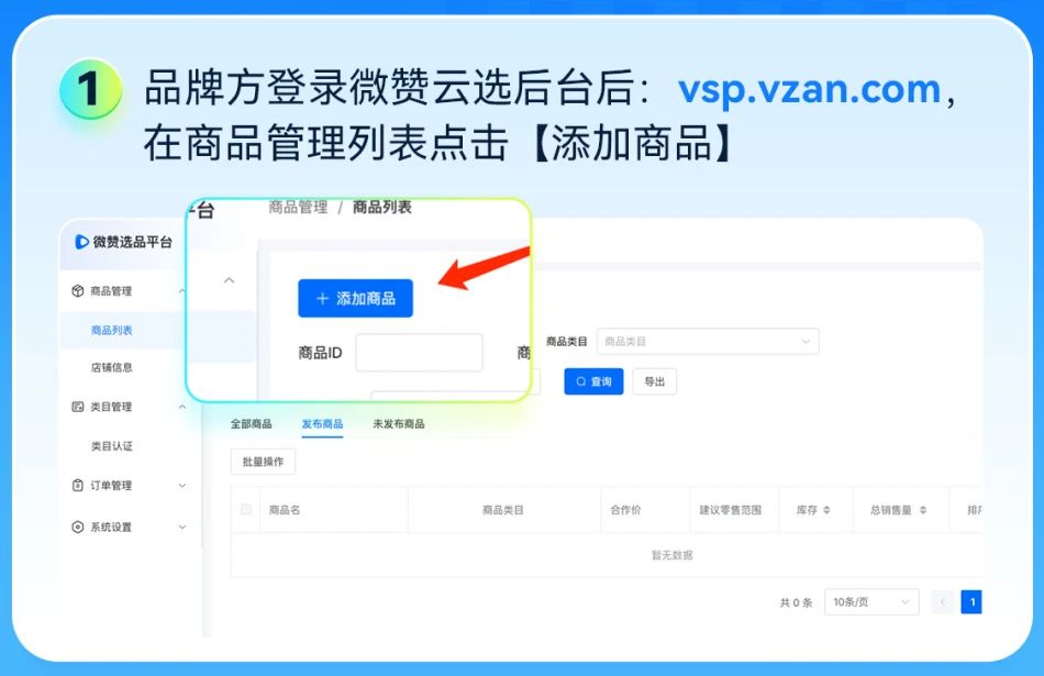 步骤1:品牌方、供应商厂家登录微赞云选后台:vsp.vzan.com,在商品管理列表点击【添加商品】。