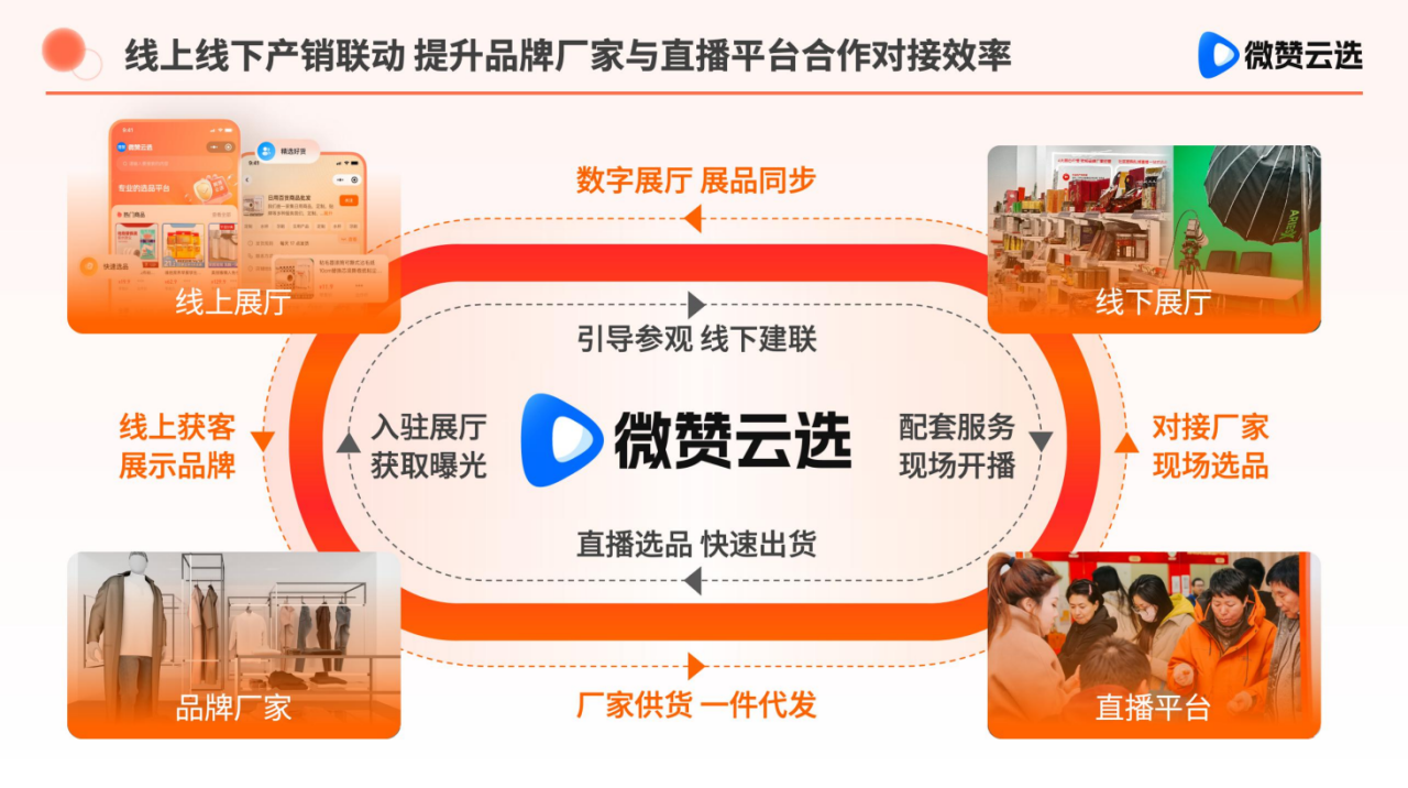 针对行业痛点,微赞基于百万级私域流量生态推出【微赞云选】平台,通过【线上云选商城】+【线下选品展厅】双驱动选品生态,助力供应商品牌方与私域直播间渠道之间的高效对接。