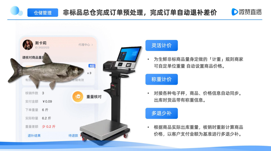 生鲜类非标品的 “称重”“计价” 是管理难点,微赞 ERP 针对性优化,让商品与库存管理更精准高效: