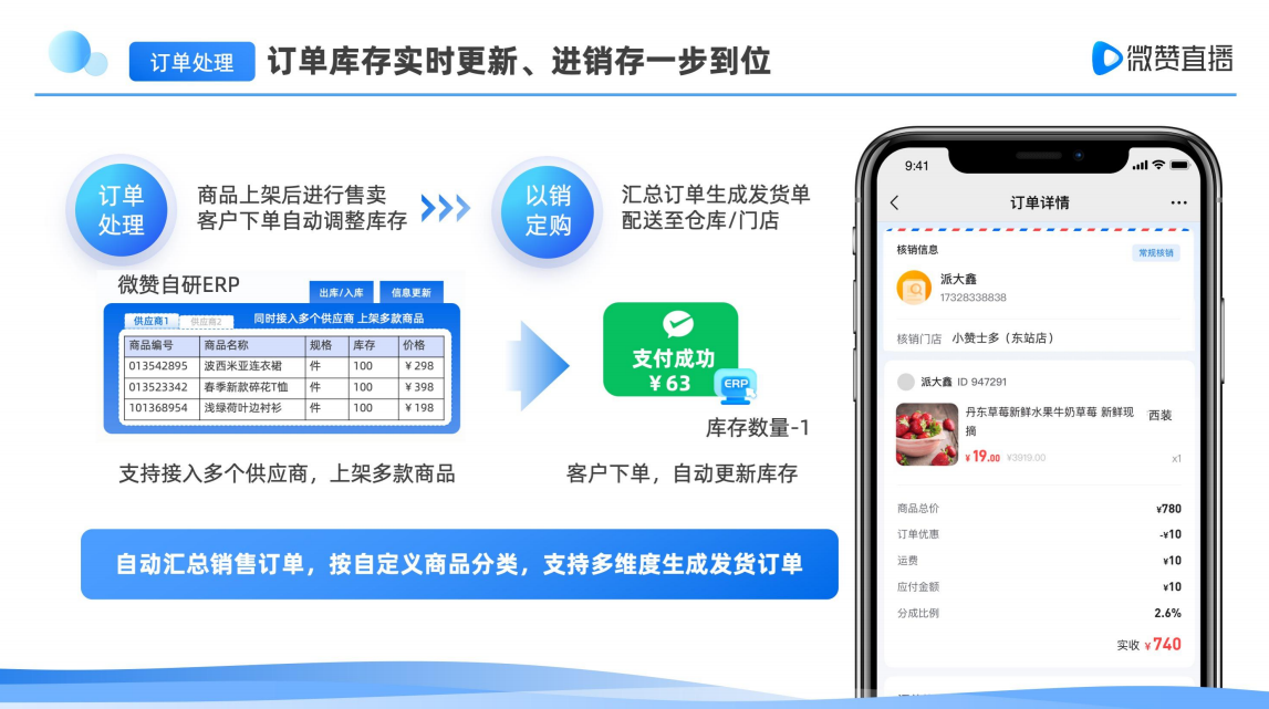 订单量激增时,人工处理易出错、效率低,微赞 ERP 让订单 “自动跑起来”: