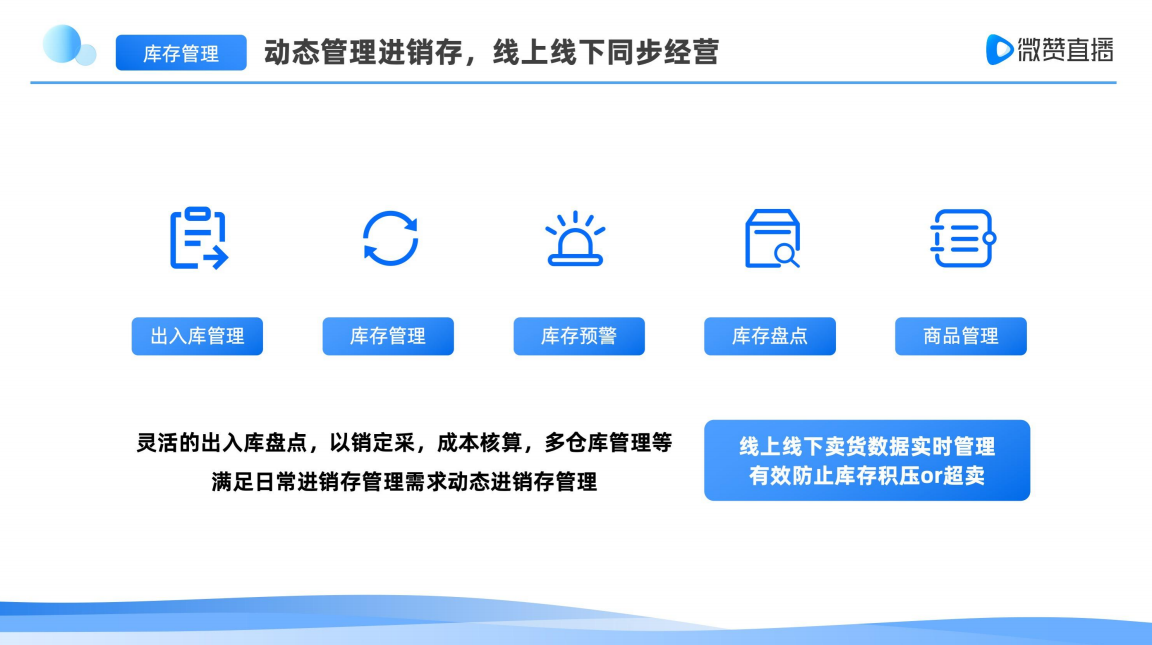 微赞自研直播零售 ERP 系统,不仅集成进销存管理、物流发货、多渠道自动分账功能,还支持无缝对接聚水潭、旺店通等市场主流 ERP 系统,实现微赞电商数据高效同步,无需维护多个后台即可完成动态进销存管理。