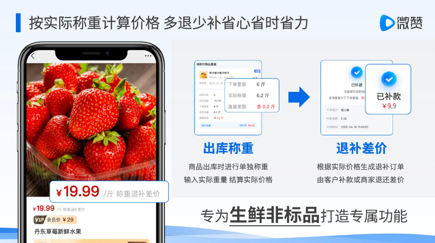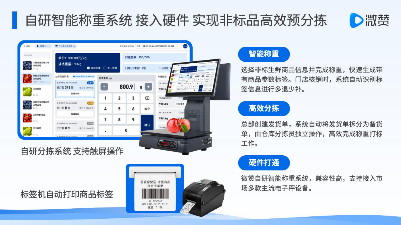 微赞智能称重系统通过软硬件一体化集成,为生鲜商家打造了从订单下发、仓库分拣到门店核销的全链路数字化闭环。